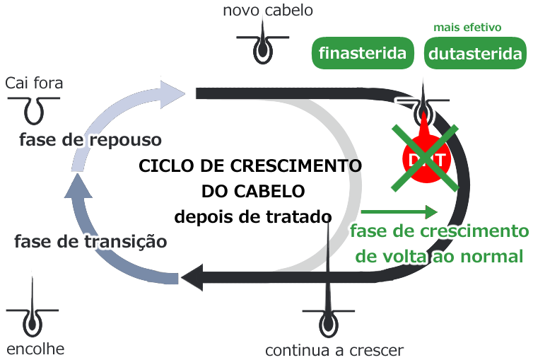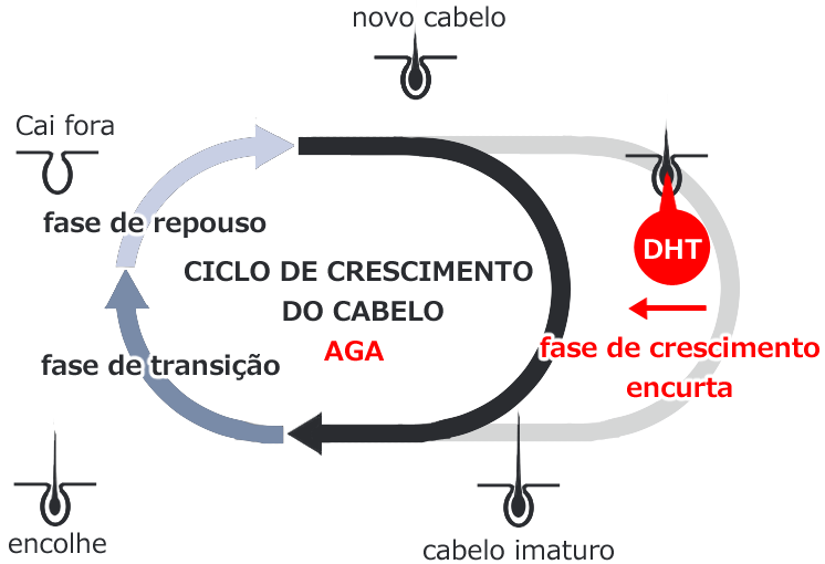 DHT (diidrotestosterona) é uma substância que perturba o ciclo normal de crescimento do cabelo e causa queda de cabelo. Isso é produzido pela ligação da testosterona, que está presente nos hormônios masculinos, a uma substância chamada 5α-redutase (tipos I e II) distribuída no couro cabeludo. Ao ligar este DHT ao receptor androgênico presente nas células da papila dérmica, ele encurta a fase de crescimento no ciclo de crescimento do cabelo, resultando na progressão do enfraquecimento do cabelo. (DHT tem várias funções importantes, como promover o desenvolvimento da genitália externa durante o período fetal de meninos, mas causa AAG e hiperplasia prostática benigna após a puberdade.)